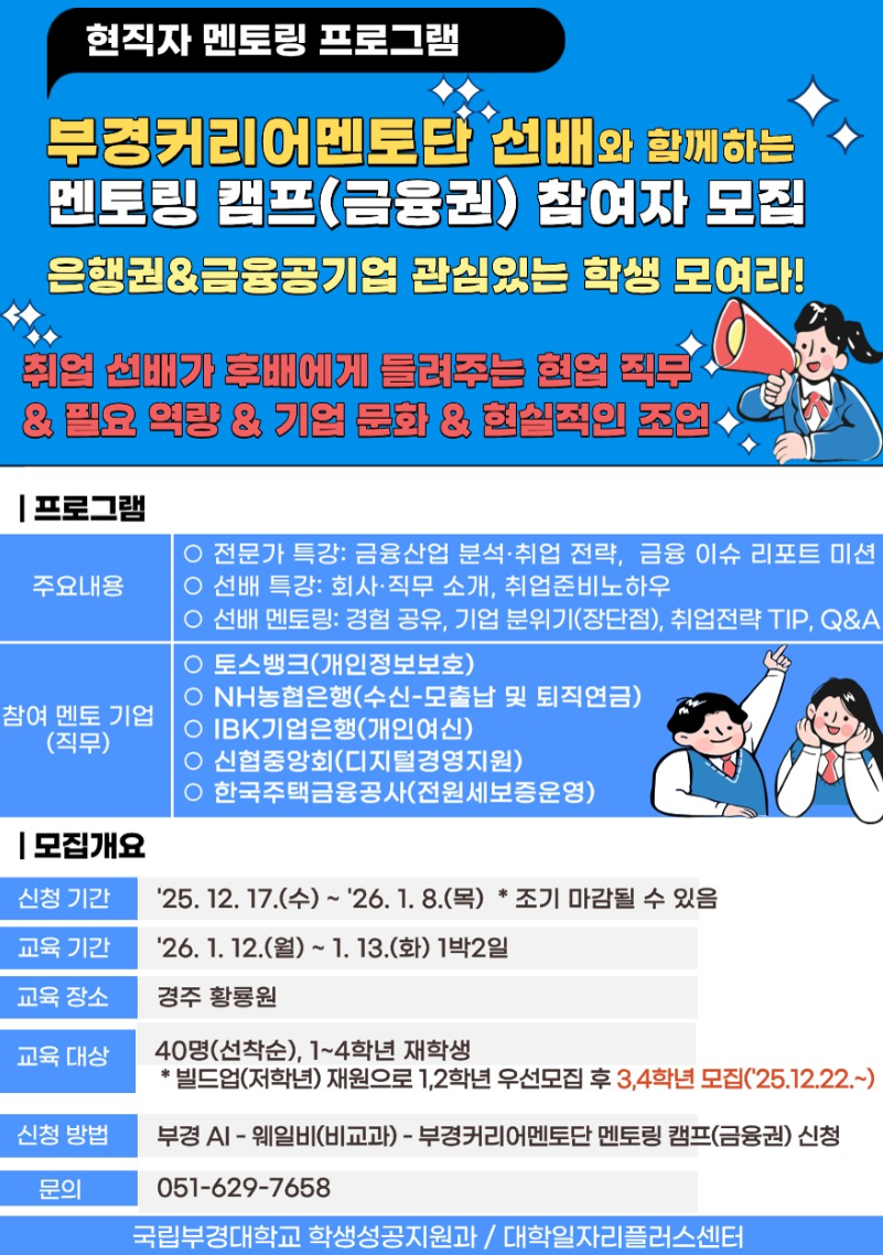 ○ 신청방법: 부경AI - 비교과(웨일비) - 부경커리어멘토단 멘토링 캠프(금융권) 신청