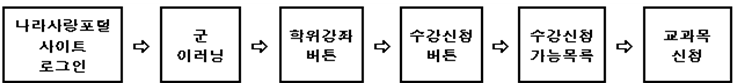 - 수강신청방법 : 나라사랑 포털 사이트(https://www.narasarang.or.kr/) 군 e-러닝