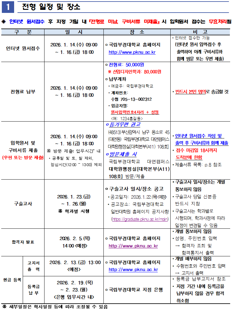 ※ 자세한 내용은 첨부파일 참고바랍니다. 첨부파일의 경우 개인정보로 인해 업로드가 어려우니 학과밴드 게시글 참고 바랍니다. 가. 모집인원: 622명(석사 445명, 박사 177명, 석?박사통합과정(박사과정 정원 내) 모집) 나. 주요일정 1. 원서접수(인터넷) : 2026. 1. 14.(수) 9:00 ~ 1. 16.(금) 18:00 국립부경대학교 홈페이지 https://www.pknu.ac.kr/main 2. 입학원서 및 구비서류 제출 : 2026. 1. 14.(수) ~ 1. 16.(금) 9:00 ~ 18:00 업무시간 내 3. 구술고사 : 2026. 1. 23.(금) ~ 1. 26.(월) 학과별 실시 4. 합격자발표 : 2026. 2. 5.(목) 14:00 <예정> 5. 현금등록 : 2026. 2. 19.(목) ~ 2. 23.(월) 은행 업무시간 내
