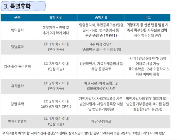 특별휴학 경우 증빙자료 필수 첨부(세부내용 아래 참고)