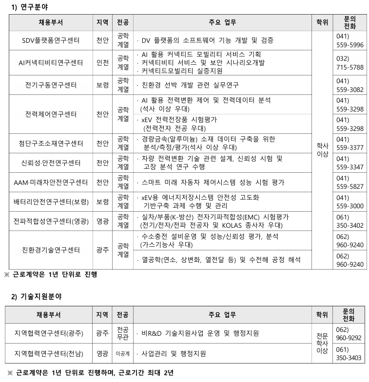 한국자동차연구원에서 아래와 같이 별정직(계약직) 직원을 모집합니다.